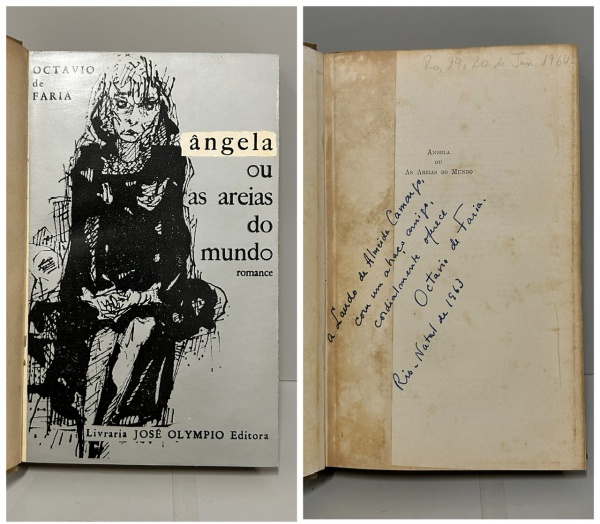 • FARIA, Octavio de. - ÂNGELA OU AS AREIAS DO MUNDO (O Anjo de Pedra-II) - Romance. Rio de Janeiro: Livraria José Olympio Editora, 1963. PRIMEIRA EDIÇÃO COM DEDICATÓRIA AUTÓGRAFA DO AUTOR: "A Laudo de Almeida Camargo, com um abraço amigo, cordialmente oferece Octavio de Faria. Rio, Natal de 1963". 390 pp. Encadernado preservando as capas da brochura, páginas com o leve amarelado do tempo em bom estado de conservação. 14,5 x 23 cm.