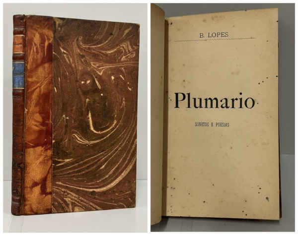 • LOPES, B. - PLUMÁRIO - Sonetos e Poesias. Rio de Janeiro: s.n., (1905?). 76 pp. Encadernado sem as capas da brochura, páginas amareladas pelo tempo e com pequenos furos, exemplar bem preservado. 13 x 21 cm.