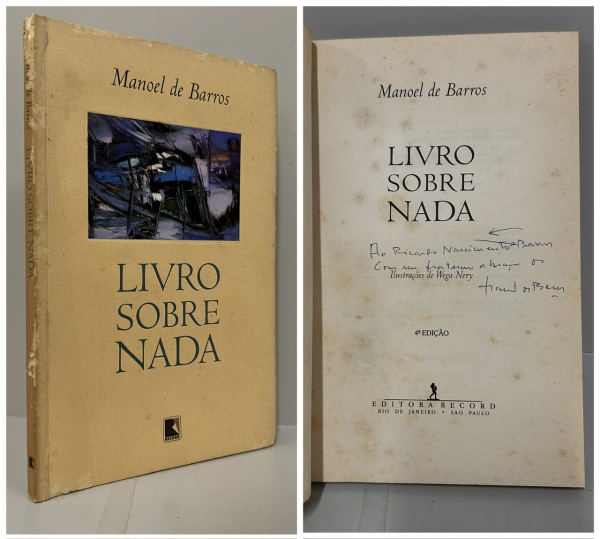 • BARROS, Manoel de. - LIVRO SOBRE NADA. Ilustrações de Wega Nery. Rio de Janeiro: Record, 1997. DEDICATÓRIA DO AUTOR: "Ao Ricardo Nascimento Barros com um fraterno abraço do Manoel de Barros". 4ª Edição. 85 pp. Brochura em bom estado de conservação. 14 x 21 cm.