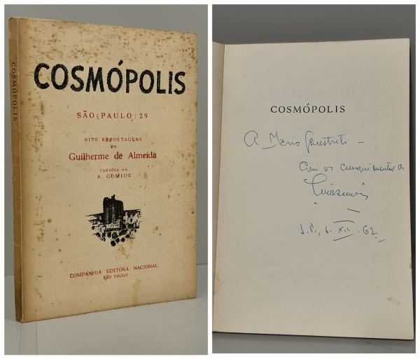 • ALMEIDA, Guilherme de. - COSMÓPOLIS - São Paulo / 29. Oito Reportagens de GUILHERME DE ALMEIDA. São Paulo: Companhia Editora Nacional, 1962. PRIMEIRA EDIÇÃO COM DEDICATÓRIA AUTÓGRAFA DO AUTOR: "A Mario .... Com os cumprimentos de Guilherme de Almeida. 62". Carvões de A. GOMIDE. São Paulo: Companhia Editora Nacional, 1962. 82 pp. + índice. Brochura em bom estado de conservação. 14 x 21 cm.