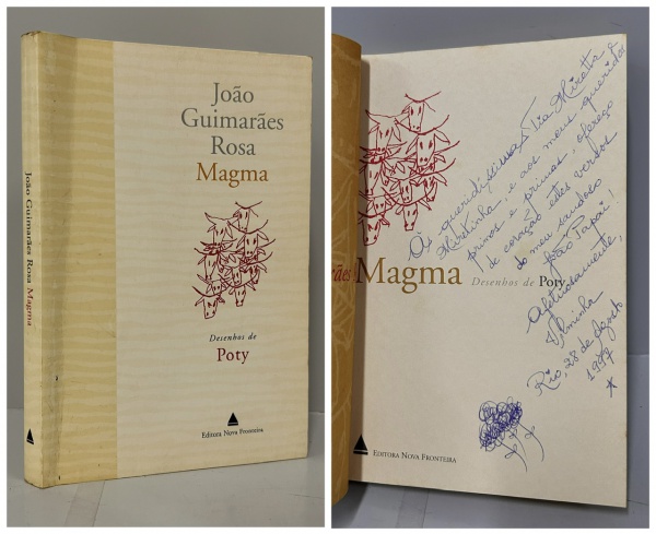 • JOÃO GUIMARÃES ROSA - MAGMA. Desenhos de Poty. Rio de Janeiro: Editora Nova Fronteira, 1997. PRIMEIRA EDIÇAO POSTUMA COM DEDICATÓRIA DA FILHA DO AUTOR, Vilma Guimarães Rosa: "As queridíssimas Tias Miretta e Miretinha, e aos meus queridos primos e primas, ofereço de coração estes versos do meu saudoso João Papai! Afetuosamente, Vilminha. Rio, 28 de agosto de 1997". 146 pp. Brochura em bom estado de conservação. 12,5  x 19 cm.