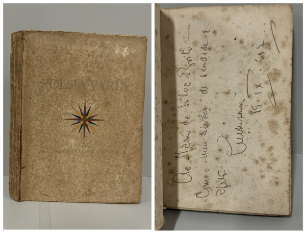 • ALMEIDA, Guilherme de. - POESIA VÁRIA. São Paulo: Livraria Martins Editôra, 1947. PRIMEIRA EDIÇÃO COM DEDICATÓRIA DO AUTOR PARA O ESCRITOR MARIO DA SILVA BRITO: "Ao Mário da Silva Brito com o meu abraço de saudade e afeto. Guilherme de Almeida. 19. IX. 947". 190 pp. Brochura com páginas integras e limpas com o amarelado natural do tempo. 14 x 19 cm.