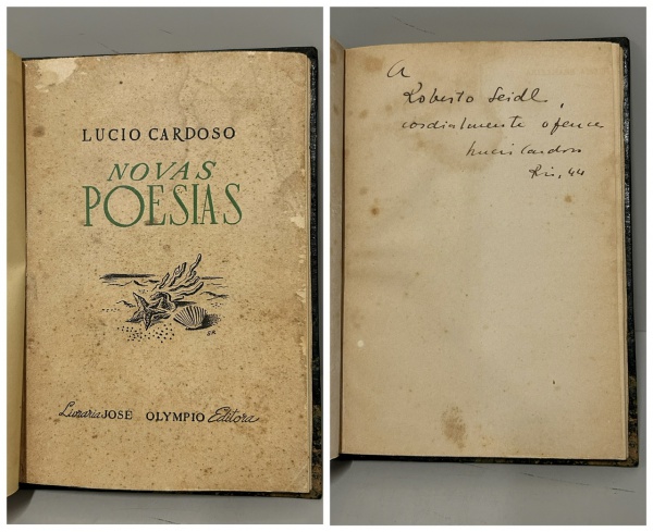 • CARDOSO, Lucio. - NOVAS POESIAS. Livraria José Olympio Editora. Rio de Janeiro: Livraria José Olympio Editora, 1944. PRIMEIRA EDIÇÃO COM DEDICATÓRIA AUTÓGRAFA DO AUTOR: "A Roberto Seidel, cordialmente oferece Lucio Cardoso. Rio, 44". 80 pp. + colofão. Encadernado com as capas da brochura em bom estado de conservação. 13 x 19 cm.