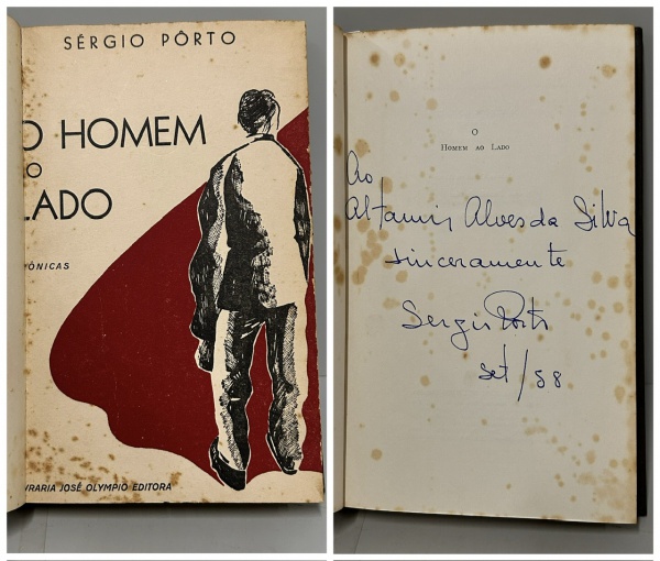 • PÔRTO, Sérgio. - O HOMEM AO LADO - Crônicas. Rio de Janeiro: Livraria José Olympio Editora, 1958. PRIMEIRA EDIÇÃO COM DEDICATÓRIA AUTÓGRAFA DO AUTOR: "Ao Altamir Alves da Silva sinceramente. Sergio Porto. Set / 58". 218 pp. Encadernado com as capas da brochura. Páginas amareladas pelo tempo. Bom exemplar. 14 x 22 cm.