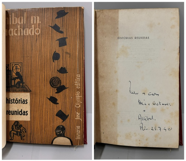 • MACHADO, Anibal. - HISTÓRIAS REUNÍDAS. Rio de Janeiro: Livraria José Olympio Editôra, 1959. PRIMEIRA EDIÇÃO COM DEDICATÓRIA AUTÓGRAFA DO AUTOR: "Para Carlos ..... o Anibal. Rio. 25.7.59". 292 pp. Encadernado com as capas da brochura em bom estado de conservação. 15 x 24 cm.