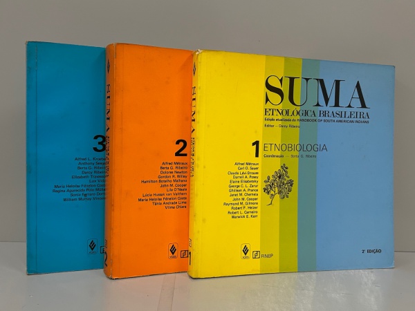 • REVISTA SUMA. - Etnológica Brasileira. Petrópolis: Finep Editora Vozes, 1987. 3 volumes. Editada por Darcy Ribeiro e coordenada por Berta G. Ribeiro, a Suma Etnológica Brasileira, originou-se da tradução de artigos selecionados do "Handbook of South American Indians", publicado entre 1945 e 1950, organizado por Julian H. Steward, obra essencial para os estudos etnológicos. A publicação do Handbook corresponde a um esforço da corrente da Ecologia Cultural, liderada por Steward, de compreender o papel do ambiente na conformação dos sistemas culturais das sociedades indígenas sul americanas. O plano geral da Suma previa sete volumes, sendo que apenas estes três primeiros chegaram a ser publicados: I. Etnobiologia: 302 pp., II. Tecnologia Indígena: 448 pp., e III. Arte Índia: 300 pp. // Brochuras originais, páginas com manchas amareladas do tempo em bom estado de conservação. 21,5 x 21,5 cm.