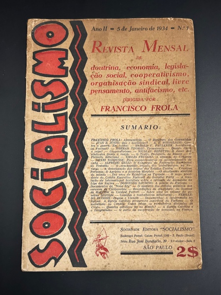 • SOCIALISMO - Revista mensal de doutrina, economia, legislação social, cooperativismo, organização sindical, livre pensamento, antifascismo, etc. São Paulo: Sociedade Editora Socialismo, 5 de janeiro de 1934. Dirigida por Francisco Frola. 48 pp. Brochura original, páginas amareladas pelo tempo em bom estado de conservação. 18,5 x 27 cm.