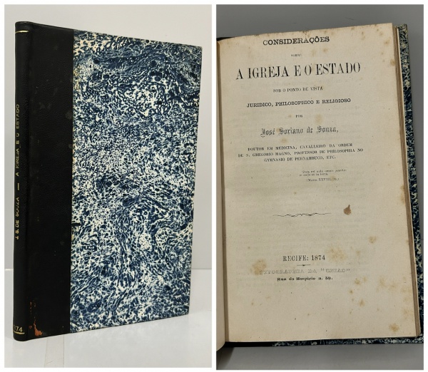 • SOUZA, José Soriano de. - CONSIDERAÇÕES SOBRE A IGREJA E O ESTADO - Sob o ponto de vista Jurídico, Philosophico e Religioso. Recife: Typographia da União, 1874. PRIMEIRA EDIÇÃO. 147 pp. + Índice. Encadernado sem as capas da brochura, páginas com manchas amareladas do tempo e mínimos furos, bem preservado. 13 x 20 cm.