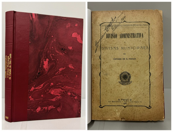 • DIVISÃO ADMINISTRATIVA E DIVERSAS MUNICIPAES DO ESTADO DE SÃO PAULO. São Paulo: Typ. Mont' Alverne, 1908. PRIMEIRA EDIÇÃO. 410 pp. Encadernado preservando a capa da brochura, páginas amareladas pelo tempo, bem preservado. 16,5 x 24 cm.