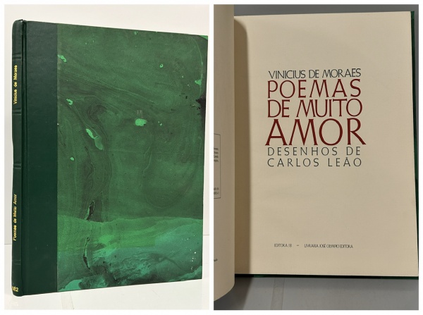 • MORAES, Vinicius de. - POEMAS DE MUITO AMOR. Rio de Janeiro: Editora J.B. - Livraria José Olympio Editora, 1982. Desenho de Carlos Leão; apresentação de Carlos Drummond de Andrade; seleção organizada por Ivan Cavalcanti Proença. 76 pp. Encadernado sem as capas da brochura, páginas amareladas pelo tempo, em bom estado de conservação. 23,5 x 31,5 cm.