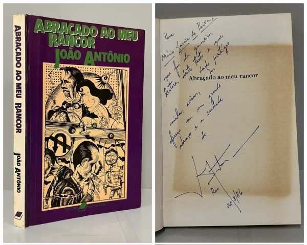 • ANTONIO, João. - ABRAÇADO AO MEU RANCOR - Contos. Rio de Janeiro: Editora Guanabara, 1986. PRIMEIRA EDIÇÃO COM DEDICATÓRIA AUTÓGRAFA DO AUOR: " Para Mário Garcia de Paiva, que foi dos primeiros leitores deste texto e que dando prestígio "Abraçado ao Meu Rancor" minhas coisas, ofereço com meu grande abraço e a saudade do João Antônio" . Acompanha uma carta datilografada pelo autor falando sobre o conto que dá título ao livro. Prêmio Nacional de Literatura Cidade de Belo Horizonte (1984). Prefácio de Alfredo Bosi, Ilustrações de Rubem Grilo. 243 pp. Brochura em bom estado de conservação. 14 x 20,5 cm.