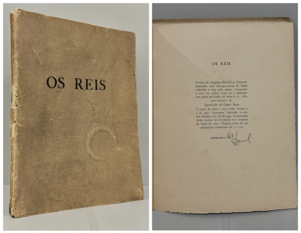 • SCHMIDT, Augusto Frederico. - OS REIS. Rio de Janeiro: Grafica de Artes, 1953. PRIMEIRA EDIÇÃO. Poema de Augusto Frederico Schmidt ilustrado com 5 zincogravuras de Darel coloridas à mão pelo artista, sendo 3 de página inteira, fora do  texto. Iniciativa da edição de Raymundo de Castro Maya. Brochura. Exemplar número 20 de uma tiragem única de 100 exemplares, NUMERADOS E ASSINADOS POR DAREL. 27 pp. Brochura com pequenos danos, páginas amareladas pelo tempo em bom estado de conservação. 26 x 34 cm.