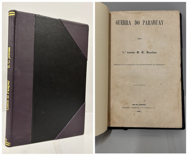 • JOURDAN, Tenente E. C. - GUERRA DO PARAGUAY. Rio de Janeiro: Typographia Perseverança, 1871. PRIMEIRA EDIÇÃO. 157 pp. Encadernado sem as capas da brochura, páginas com mínimos furos e amareladas pelo tempo, bem preservado. 17 x 25 cm.