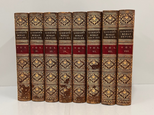 • GIBBON, Edward. - THE HISTORY OF THE DECLINE AND FALL OF THE ROMAN EMPIRE. With notes by Dean Milman and M. Guizot. A New Edition, with additional notes, by WILLIAM SMITH, D.C.L. & LL.D. In eight volumes. With Portrait and Maps. London: John Murray, 1881. Encadernação de época em pleno couro marrom e marmorizado nos três cortes. Ótimo estado de conservação. 415 pp. + Map Império Romano; Map The Imigrations of the Barbarians + 425 pp. + mapa; Western Asia + 433 pp. Europe + 410 pp.; Italia + 415 pp. + The Eastern Empire divide into Themes; Map of the Mahometan Empire + 428 pp. + Map Europe and parto f Asia and Africa at the Time of Charlemagne; Map of the Crusades + 412 pp..; Map Ancient Rome 434 pp. + Map. Environs Rome. Encadernação de época em pleno couro marrom e marmorizado nos três cortes. Páginas íntegras e limpas. Ótimo estado de conservação.14 x 22 cm. Versão completa e anotada de uma das obras histórias mais famosas da língua inglesa.