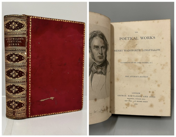 • THE POETICAL WORKS OF HENRY WADSWORTH LONGFELLOW. Illustrated by Sir John Gilbert, R. A. The authors Edition. London: George Routledge and Sons, 1881. 504 pp. Encadernação antiga em pleno couro vermelho com douração, páginas íntegras, sem grifos ou anotações com os três cortes aquarelados. Ligeiros picos de insetos nas duas primeiras páginas e nas três últimas. Nada de mais. 14 x 20 cm.
