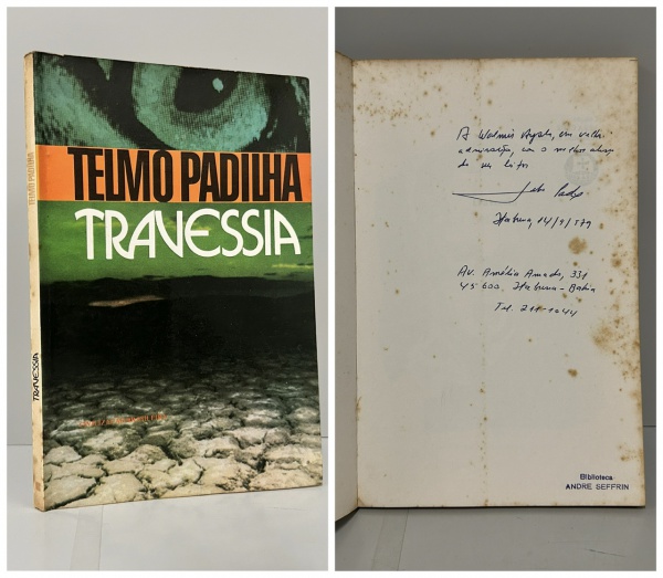 • PADILHA, Telmo. - TRAVESSIA. Rio de Janeiro: Civilização Brasileira, 1979. PRIMEIRA EDIÇÃO COM DEDICATÓRIA DO AUTOR PARA O POETA WALMIR AYALA: " A Walmir Ayala, uma velha admiração, com o melhor abraço de seu leitor Telmo Padilha. ...14/9/979". 122 pp. Brochura em bom estado de conservação. 14 x 21 cm.