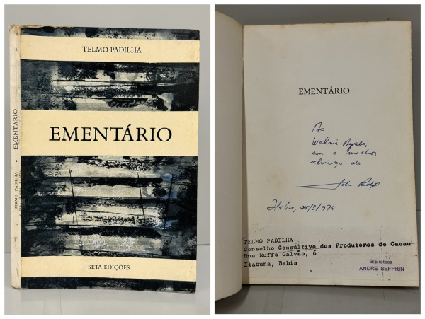 • PADILHA, Telmo. - EMENTÁRIO.  Rio de Janeiro: Seta Edições, 1974. PRIMEIRA EDIÇÃO COM DEDICATÓRIA DO AUTOR PARA O POETA WALMIR AYALA: " Ao Walmir Ayala, com o melhor abraço do Telmo Padilha. Itauna, 25/3/975". 84 pp. + índice. Brochura em bom estado de conservação. 12 x 18 cm.