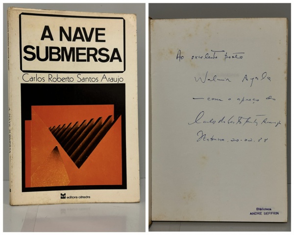 • SANTOS ARAUJO, Carlos Roberto. - A NAVE SUBMERSA - Poemas.  Rio de Janeiro: Editora Cátedra, 1986. PRIMEIRA EDIÇÃO COM DEDICATÓRIA DO AUTOR PARA O POETA WALMIR AYALA: " Ao excelente poeta Walmir Ayala com o apreço do Carlos Roberto Santos Araújo. Itabuna, 20.02.88". 87 pp. Brochura em bom estado de conservação. 14 x 21 cm.