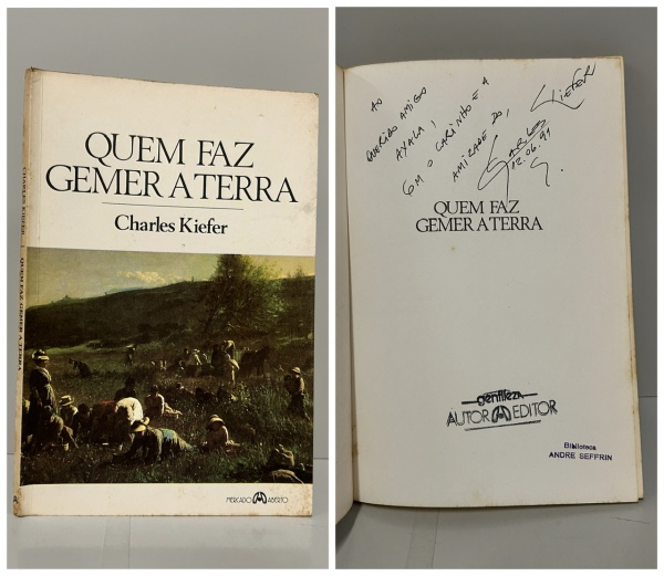 • KIEFER, Charles. - QUEM FAZ GEMER A TERRA. Porto Alegre: Editora Mercado Aberto, 1991. PRIMEIRA EDIÇÃO COM DEDICATÓRIA DO AUTOR PARA O POETA WALMIR AYALA: " Ao Querido amigo Ayala, com o carinho e a amizade do, Carlos Kiefer. 12,06,91". 114 pp. Brochura em bom estado de conservação. 14 x 21 cm.