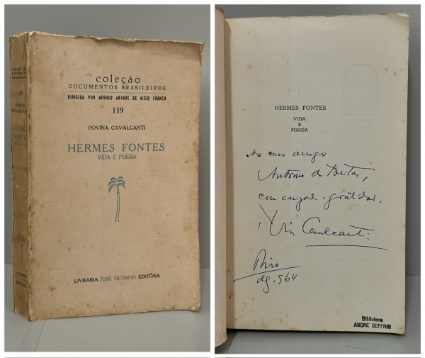 • CAVALCANTI, Povina. - HERMES FONTES - Vida e Poesia. Rio de Janeiro: Livraria José Olympio Editora, 1964. PRIMEIRA EDIÇÃO COM DEDICATÓRIA DO AUTOR: "Ao caro amigo Antonio de Freitas, com amizade e gratidão, Povina Cavalcanti. Rio dez, 964". 257 pp. Brochura em bom estado de conservação. 14 x 22 cm.