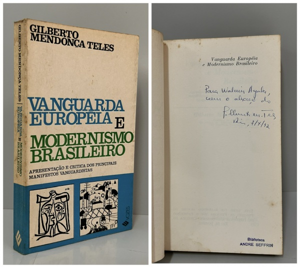 • TELES, Gilberto Mendonça. - VANGUARDA EUROPEIA E MODERNISTO BRASILEIRO: Apresentação e Crítica dos Principais Manifestos Vanguardistas. Petrópolis: Vozes, 1972. PRIMEIRA EDIÇÃO COM DEDICATÓRIA AUTÓGRAFA PARA O POETA WALMIR AYALA:  Para Walmir Ayala, com o abraço do Gilberto Mendonça Teles. Rio, 7/4/72". 271 pp. Brochura em bom estado de conservação. 12 x 20 cm.